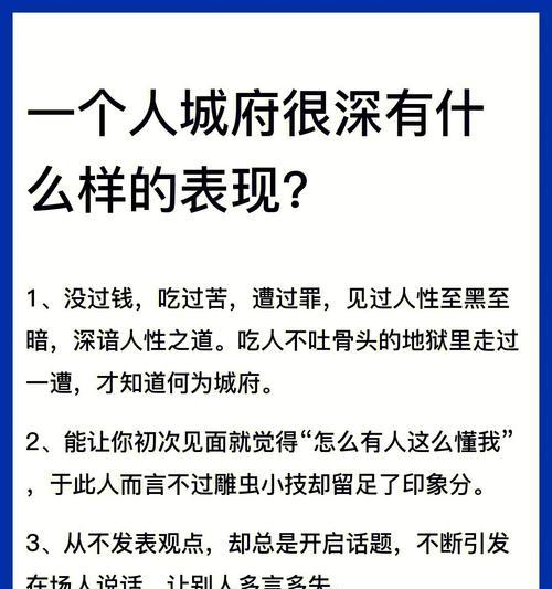 城府很深的人,是指那些表面上看起来平静、温和,内心却谋划着各种计谋的人。他们常常让人摸不透底,不知道他们究竟在想些什么,但却总能在关键时刻站出来,扮演着关键的角色。城府很深的人有哪些特点呢?让我们来一起探究。